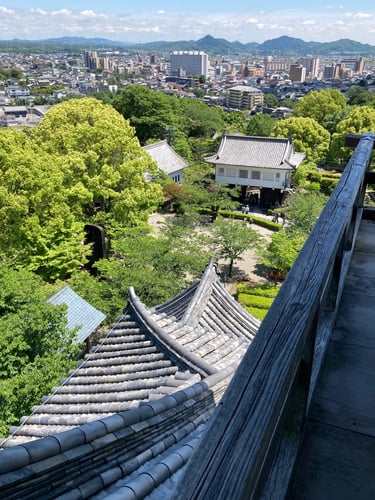 Inside, narrow staircases creak beneath your feet, and wooden beams still bear the marks of centuries past. The highlight is the top-floor veranda, a rare feature among Japanese castles, offering breathtaking 360° views of: