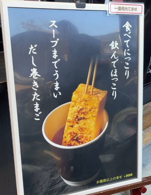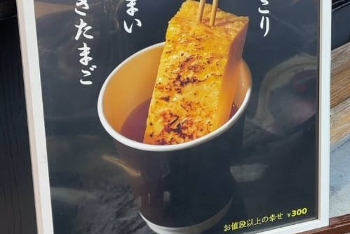 Thick, juicy, slightly sweet rolled omelet made fresh to order. Served on a stick for easy walking snacks. Often finished with soy-based sauce or daikon.
