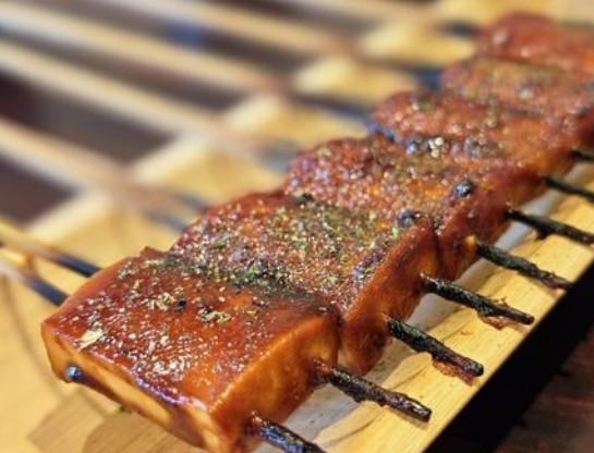 Tofu grilled over charcoal and topped with different miso sauces: spicy red, sweet white, sesame, and yuzu. Great for vegetarians and full of umami.